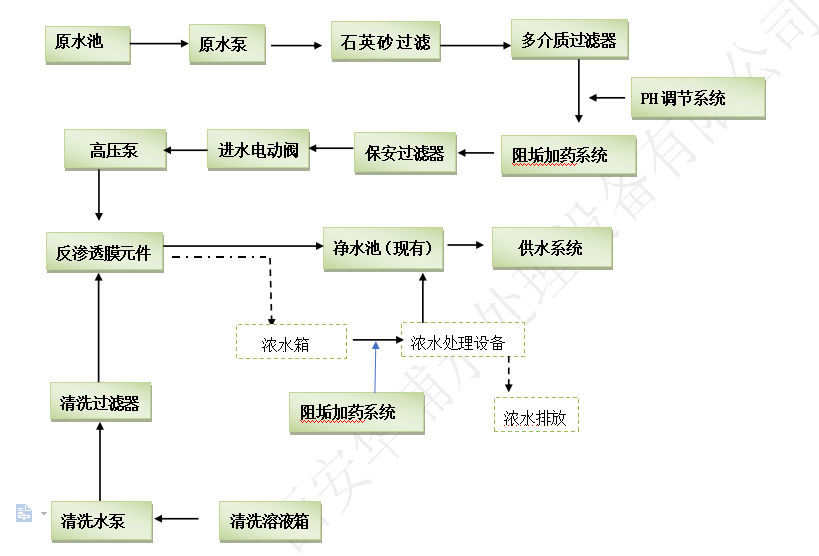 項(xiàng)目工藝:采用“換熱器+多介質(zhì)過(guò)濾器+PH調(diào)節(jié)系統(tǒng)+阻垢加藥裝置+精密過(guò)濾器+反滲透膜法為一體的全自動(dòng)成套設(shè)備”水處理工藝