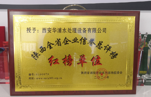 近日,西安華浦水處理設備有限公司被評為“陜西全省企業信用總評榜紅榜單位”。