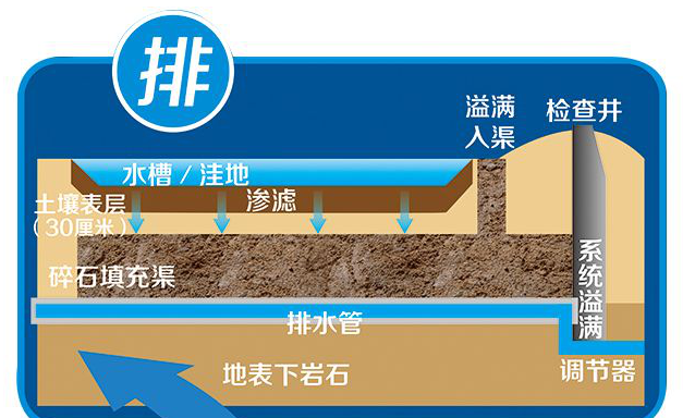 改變各種路面、地面鋪裝材料,改造屋頂綠化,調(diào)整綠地豎向,從源頭將雨水留下來然后“滲”下去。